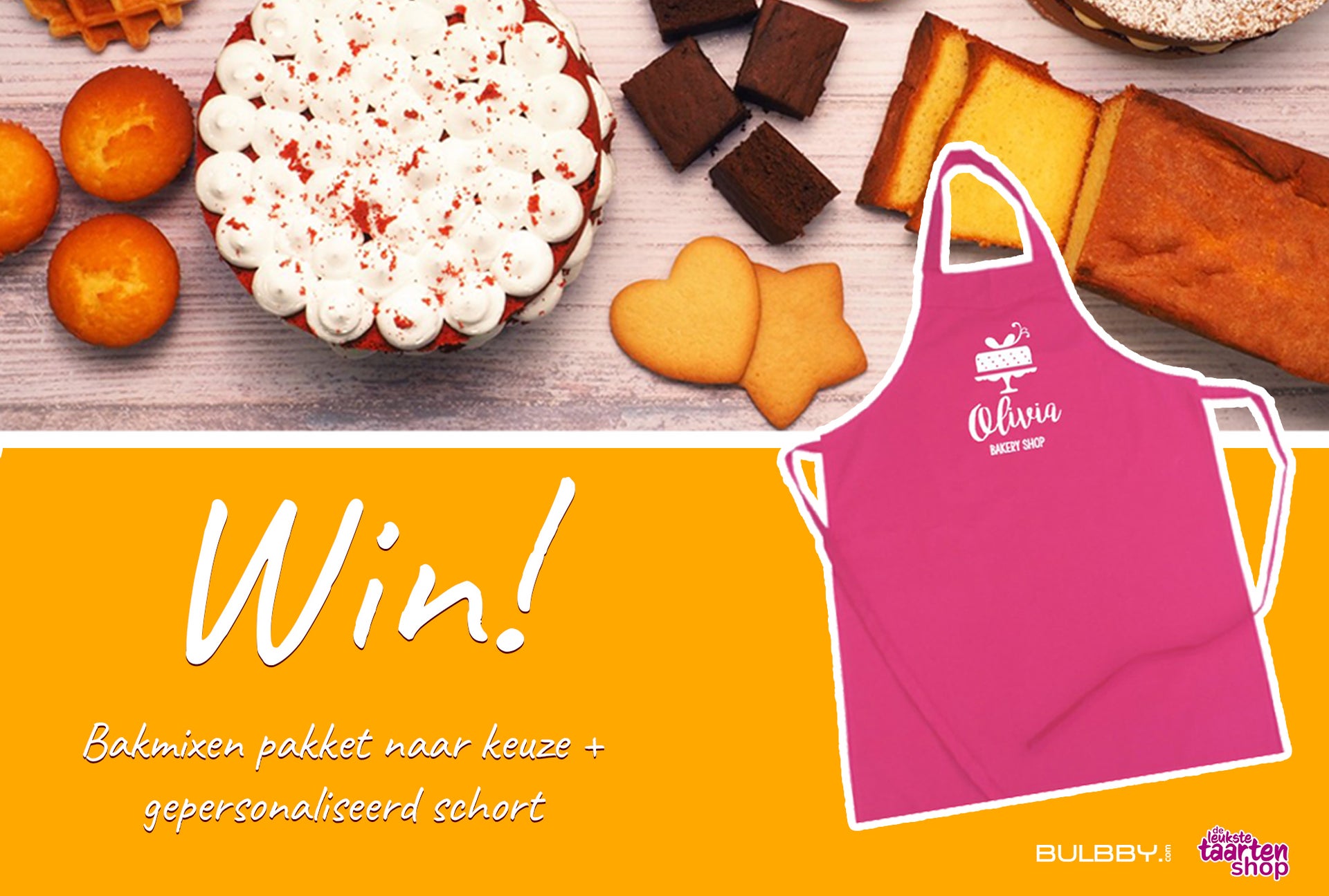 Wij gaan het bakseizoen knallend van start met en super leuke winactie in samenwerking met Bulbby, dé shop voor gepersonaliseerde producten voor jong en oud (zoals schorts, ovenwanten en meer!). Door mee te doen aan deze winactie kan jij kans maken op een bakpakket van maar liefst 5 bakmixen naar keuze (max. 1kg) + een gepersonaliseerd schort van Bulbby.