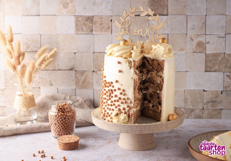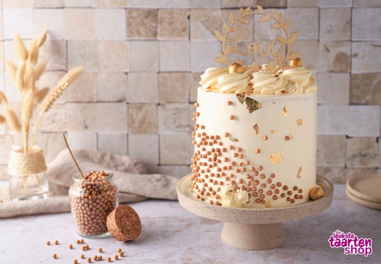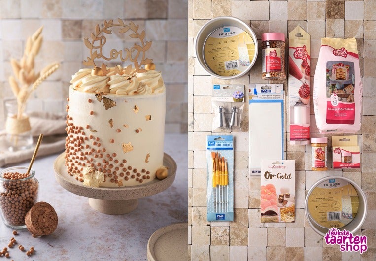 Bij Deleukstetaartenshop kun je voor veel benodigdheden voor deze Dulce de Leche taart terecht en wij hebben dan ook ontzettend veel keus! Met de FunCakes mix voor Biscuit heb jij bijvoorbeeld al een goede basis voor jouw stapeltaart. Deze is aan smaak gebracht met de heerlijke Dulce de Leche smaakpasta van FunCakes. Vervolgens maakte Eefje de botercrème die ook op smaak werd gebracht met de smaakpasta. Hiermee werd de taart strak afgesmeerd en vervolgens nog prachtig versierd met onder andere deze Choco gezouten karamel parels van FunCakes en bladgoud.