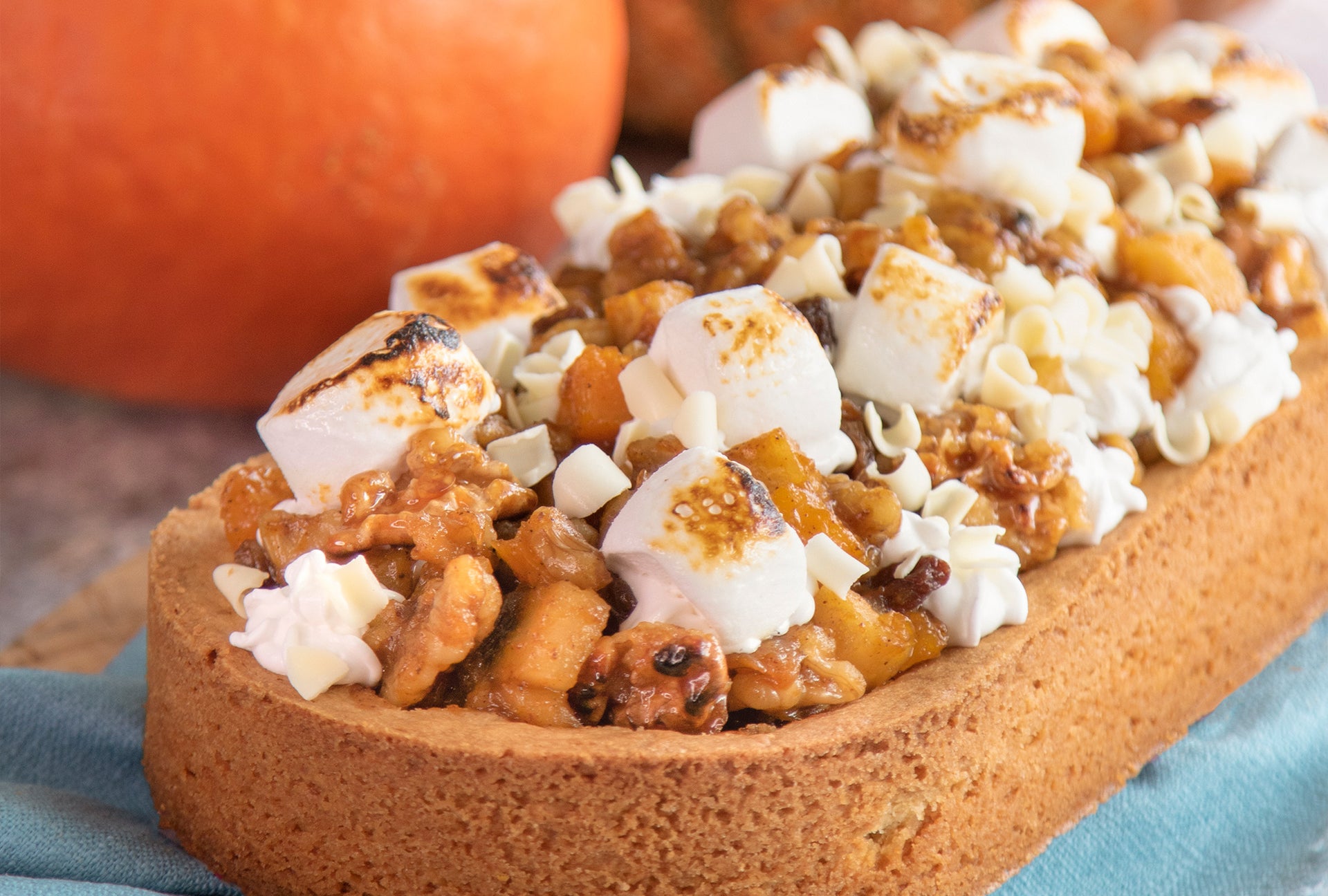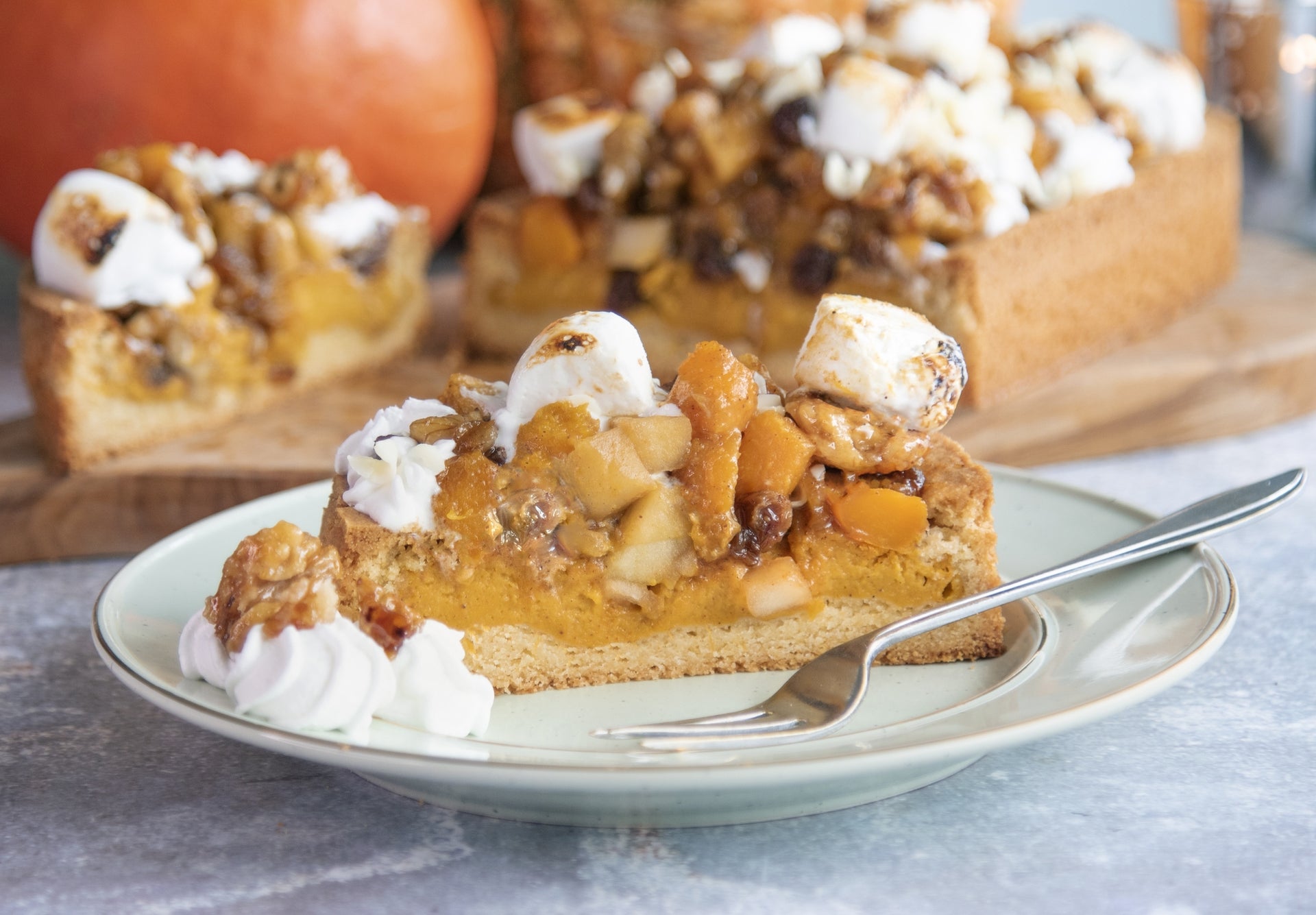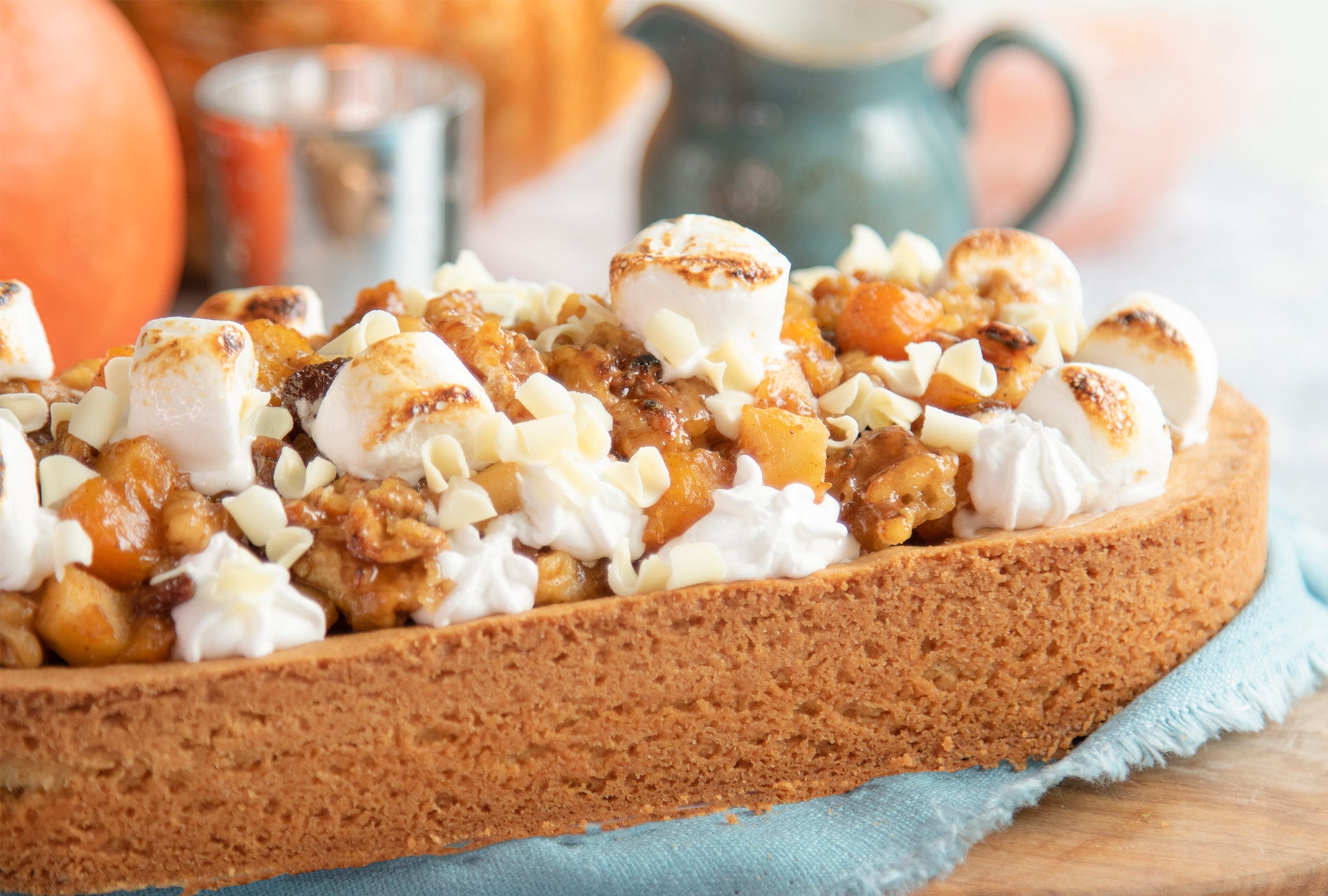 De Pumpkin Spice Slof met Appel is opgebouwd vanuit een heerlijke sloffenbodem met daarop een herfstige pumpkin spice vulling in plaats van de standaard amandelspijsvuling die je vaak ziet bij slof recepten. Daarna komt een laag met een heerlijk appel, pompoen en rozijnen mengsel. En als finishing touch is de slof gedecoreerd met toefjes slagroom of botercrème, marshmallows en chocolade strooisels