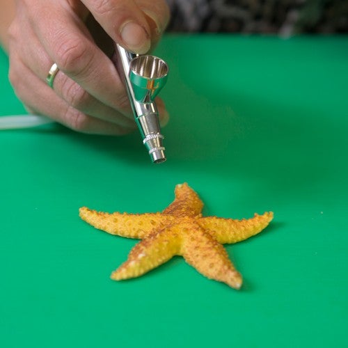 Zet de airbrush klaar. Spuit met blauw op de taarten, zodat je en golvend effect krijgt. Gebruik de andere kleuren om de zeewier, spons schelpen en dieren mooie effecten te geven. Laat alles drogen en plak het daarna op de taart. Maak een klein plakje fondant om een eilandje te maken. Leg dat op de bovenste taart en steek daar de boomstam door. Bevestig de palmbladeren door de eindjes draad in de fondant in de boomstam te drukken.